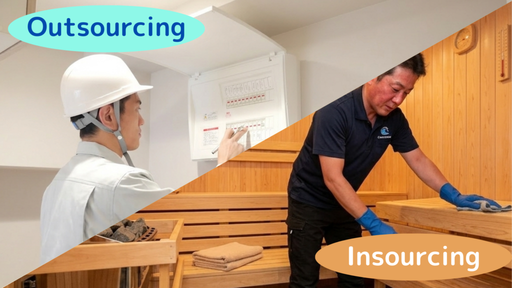- 作業頻度と専門性:毎日発生し、かつ高度な技術を要さない作業(例:ゴミの除去)は内製。年数回で、高度な技術や道具が必要な作業(例:電気系統の清掃、石の全交換)は外注。