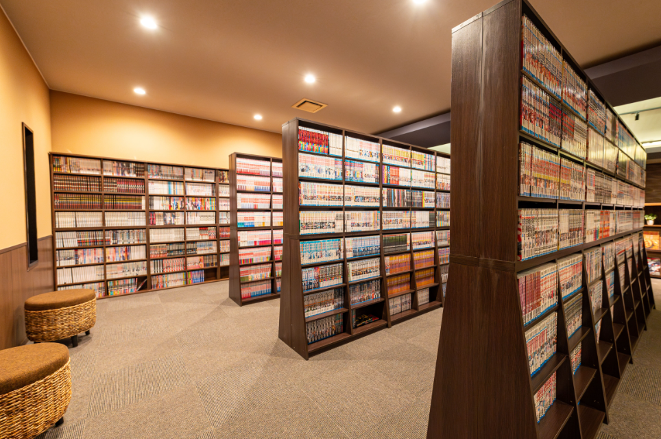 ラウンジエリアでは1万5,000冊のコミック・雑誌をご用意。また、マッサージチェアや無料コーヒーも完備されており、時間が経つのを忘れてしまうほど至福のリラックスタイムを過ごすことができます。